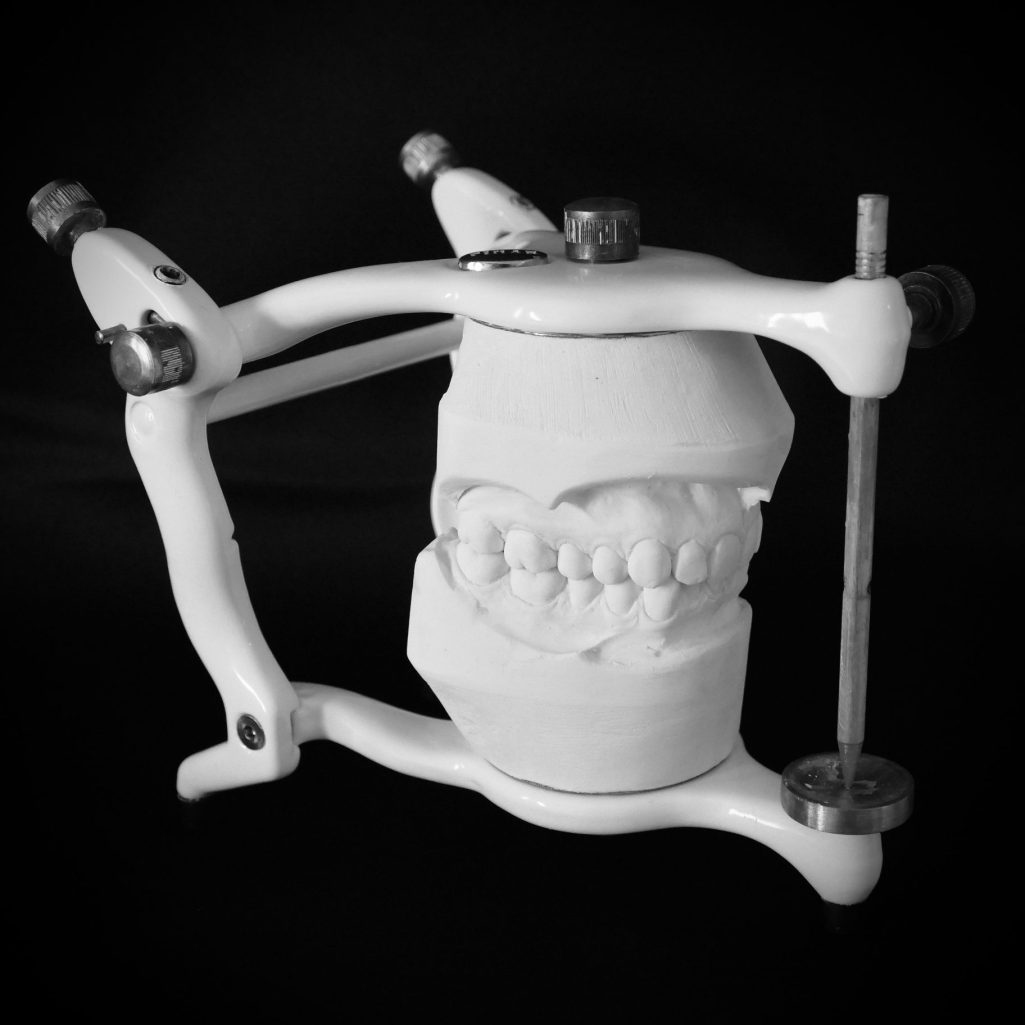 Zahntechnische Laborarbeit: Das eigene Gebiss in einem historischen aufgearbeitetem Mittelwertartikulator zur funktionellen und optischen Darstellung der Okklusion.