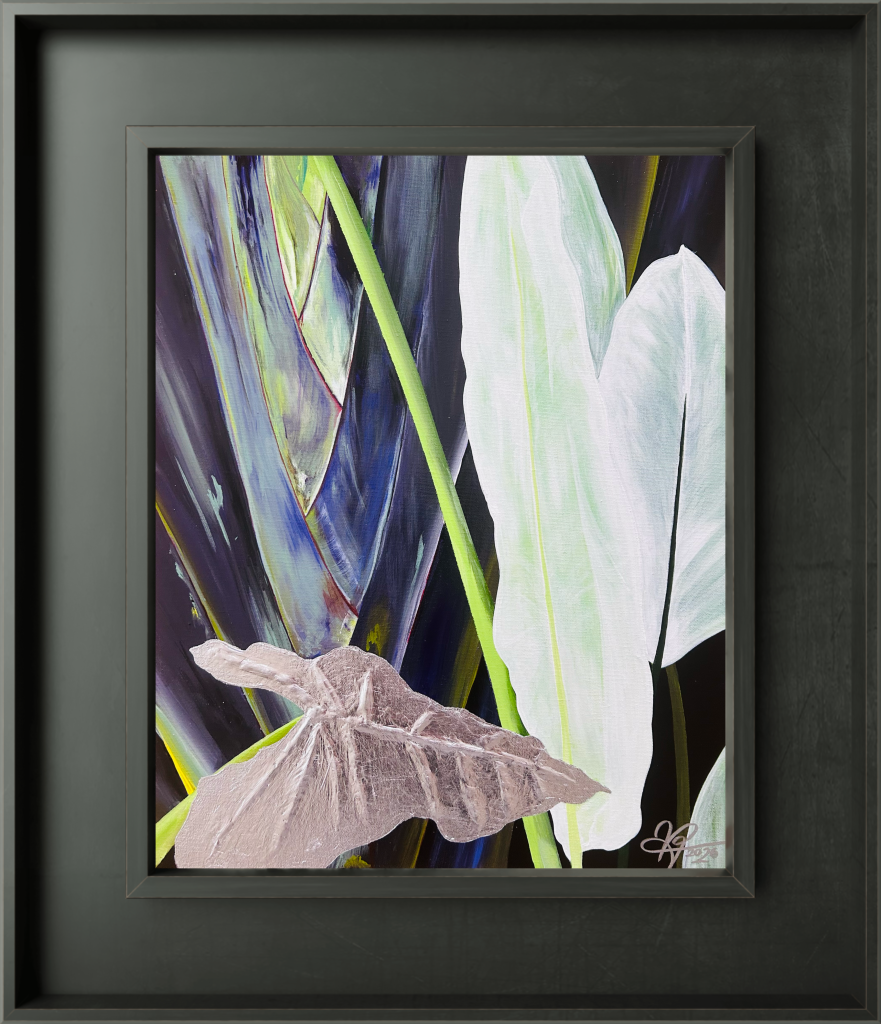 - Riesenblättriges Pfeilblatt (lat. Alocasia macrorrhizos) - links im Vordergrund // Die Pfeilblätter standen hier vollkommen im Schatten und wirkten dabei beinahe Traurig, obwohl sie Formschön um ihre Aufmerksamkeit buhlte. Deshalb bekam sie Struktur und ein schillerndes Kleid aus Blattsilber.